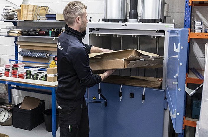 Powerful pneumatic pressing capabilities with a very short pressing cycle of about 15 seconds and a footprint of just 1 m². Connecting directly to an existing air supply, the third generation A406 cardboard and plastic baler achieves unsurpassed efficiency.
